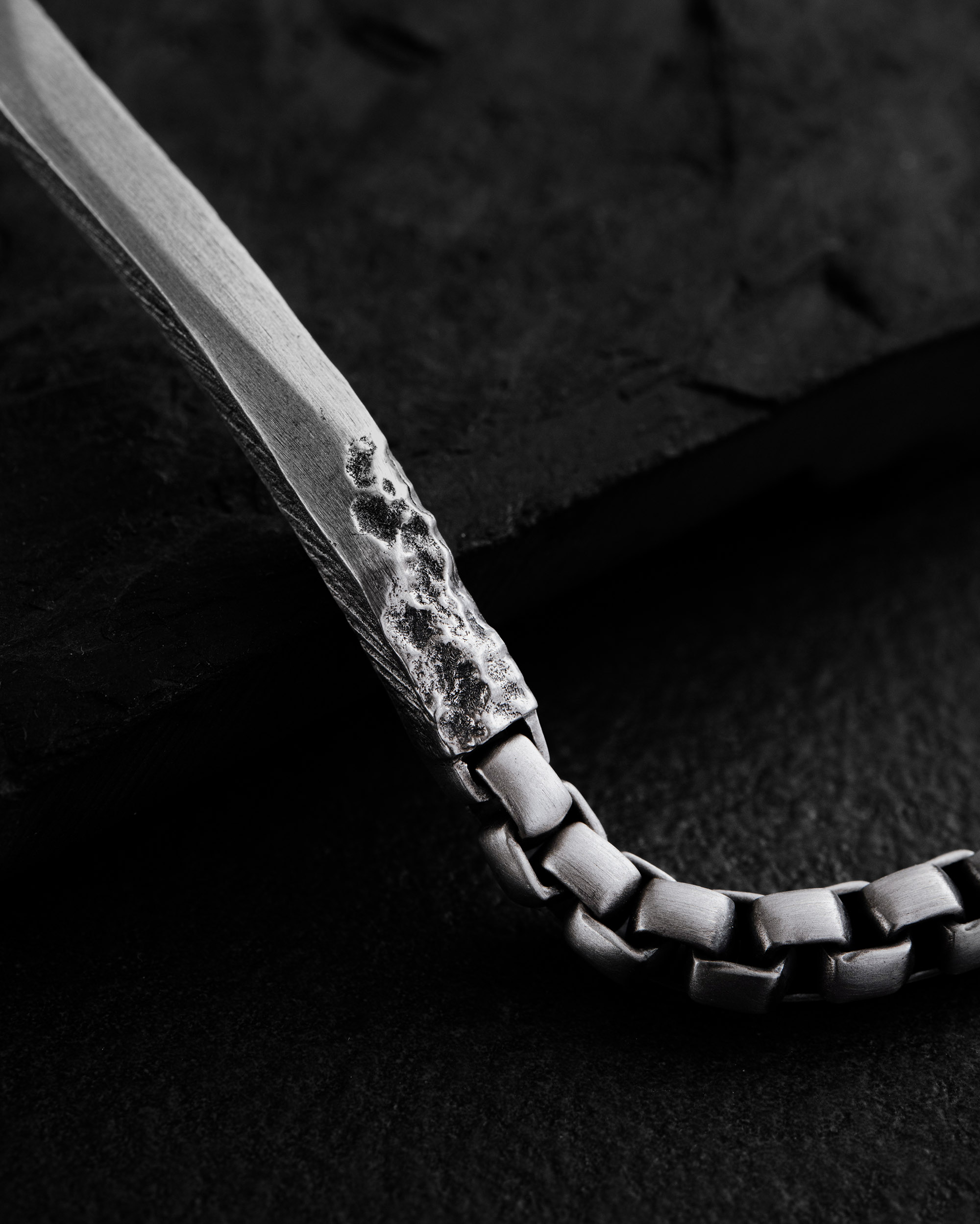 Fakturowana powierzchnia bransolety przypomina ślady młota na metalu — ślady przebytej drogi, które czynią ją wyjątkową. FORGED to biżuteria dla mężczyzny, który nie szuka łatwych dróg, lecz kształtuje siebie poprzez działanie, determinację i doświadczenie.