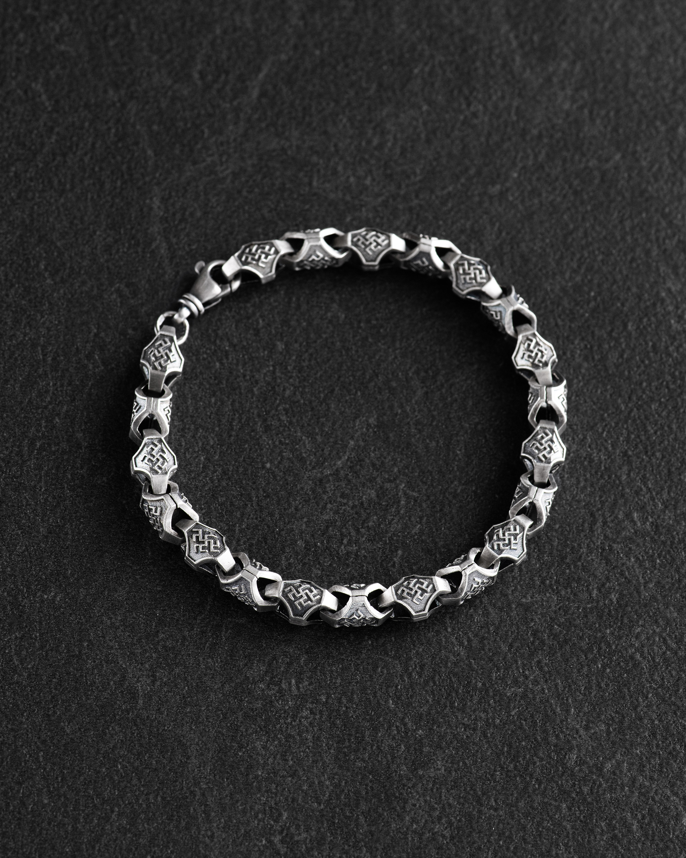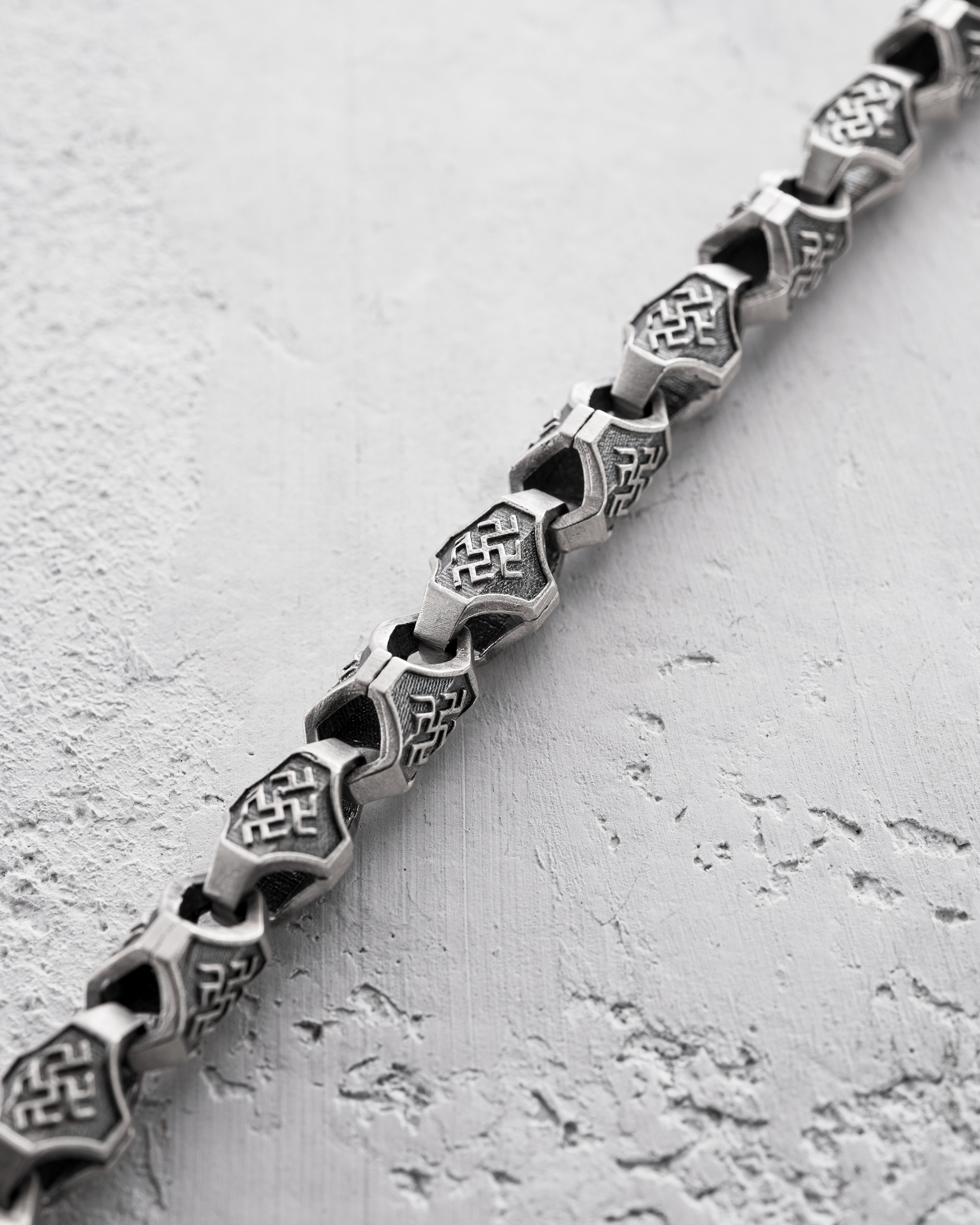 Bransoletka "SVARGA" to nie tylko efektowna ozdoba, ale także symboliczny wyraz więzi ze słowiańską mitologią i duchowym dziedzictwem. Nazwa "SVARGA" odnosi się do pogańskiego symbolu związanego z bogiem Swarogiem, który w kulturze słowiańskiej odzwierciedla słońce, ogień i kosmiczną siłę. Ten symbol może stymulować rozwój wewnętrzny oraz wzmacniać wiarę we własne możliwości. Pomaga poczuć się częścią wspólnoty, sprzyjając akceptacji tradycji i duchowych wartości narodu.