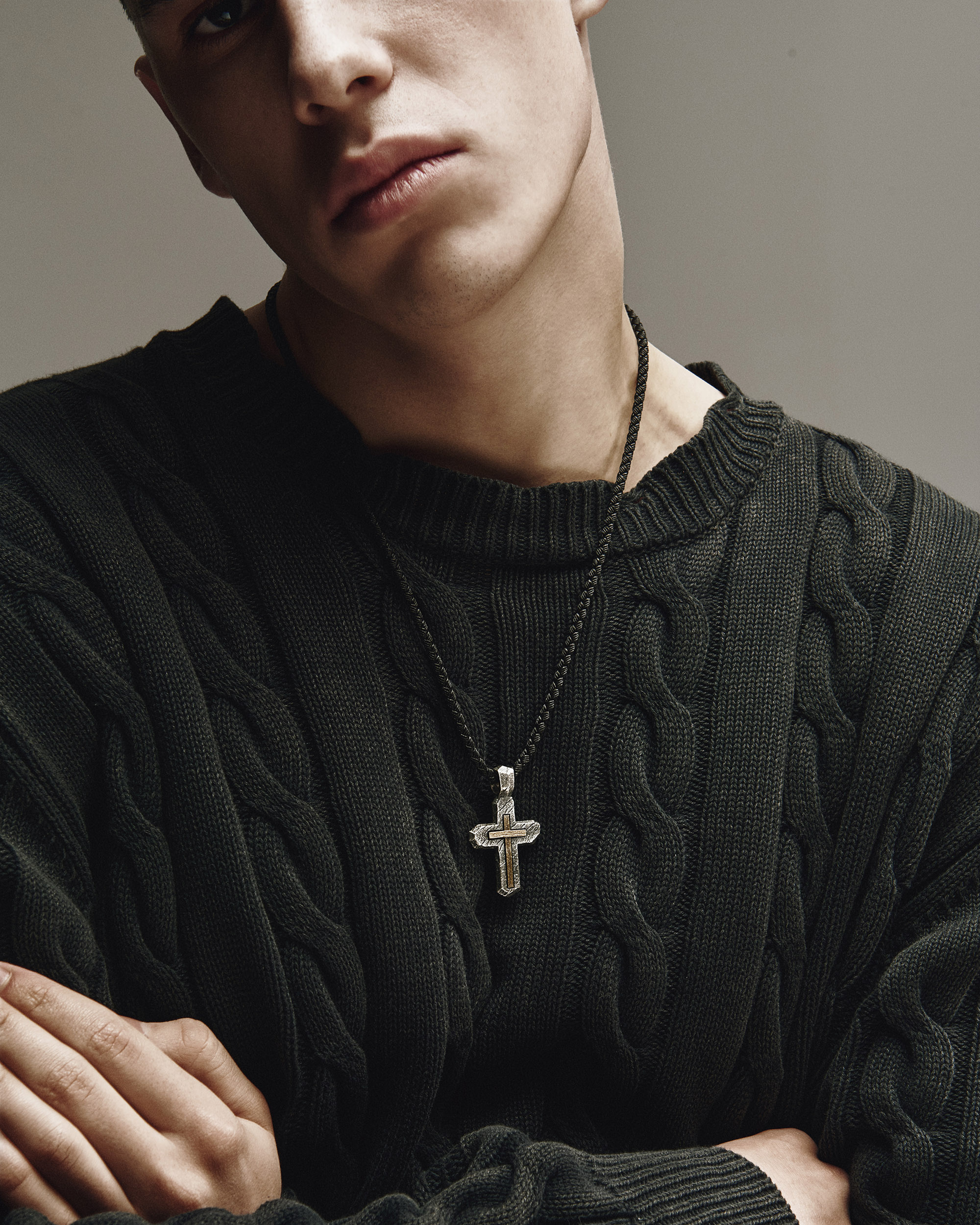 CALVARY CROSS. IN GOD WE TRUST to srebrny krzyż ze wstawką z żółtego złota 750, wykonany w masywnym, teksturowanym stylu, który oddaje siłę wiary i wytrwałość wobec życiowych prób. Centralna złota wstawka podkreśla sakralny charakter symbolu i przypomina o świetle prowadzącym przez ciemność. Na rewersie znajduje się napis IN GOD WE TRUST („Pokładamy ufność w Bogu”), będący cichym, lecz pewnym przypomnieniem o zaufaniu Bożemu prowadzeniu i wewnętrznej sile. CALVARY CROSS to biżuteria dla tych, którzy widzą w krzyżu nie tylko tradycję, lecz także osobisty talizman i źródło duchowej niezłomności.