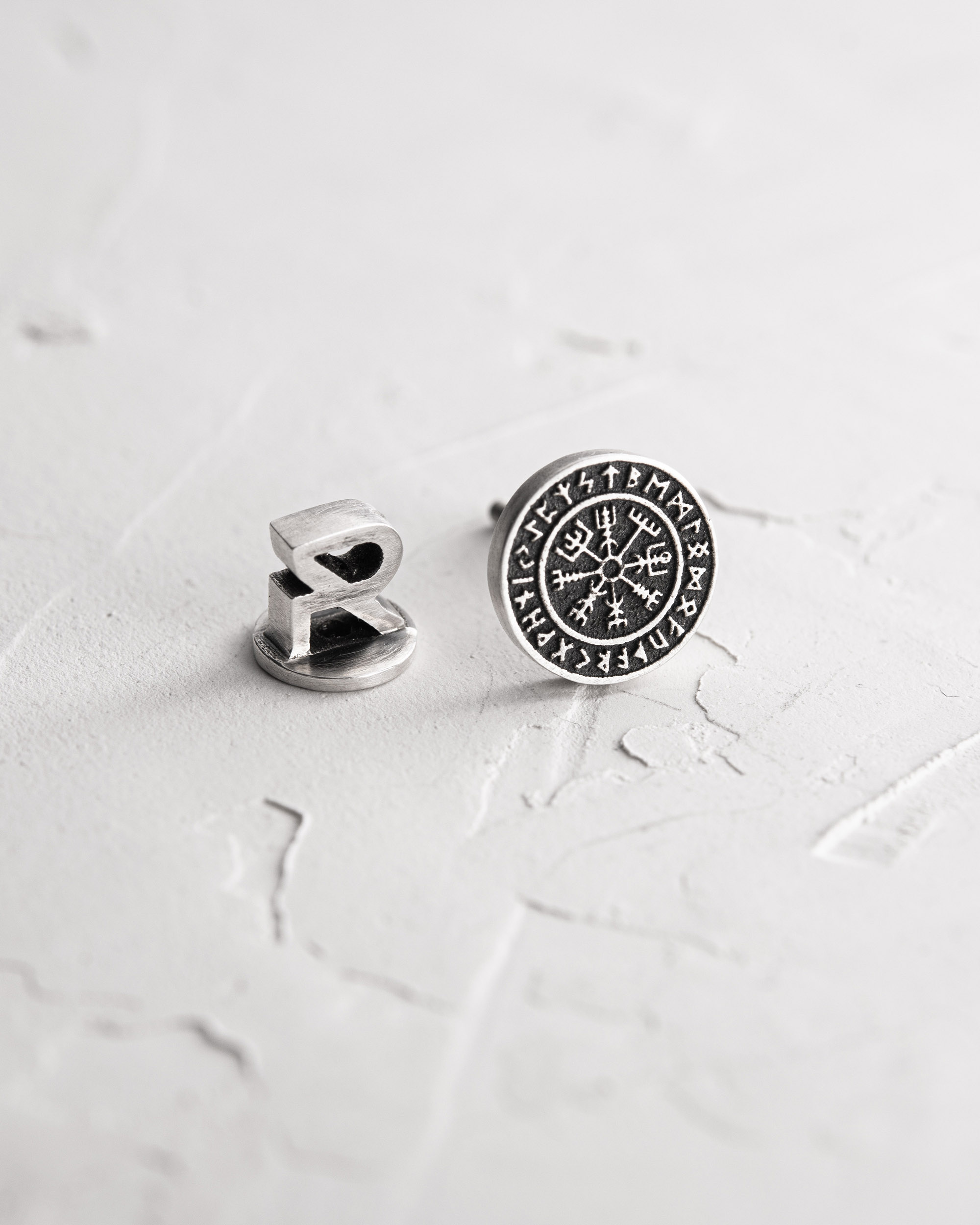 Otaczający go krąg runiczny wzmacnia ochronne znaczenie symbolu, czyniąc kolczyk talizmanem kierunku, wewnętrznego głosu i wytrwałości.