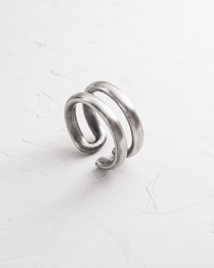 Srebrny pierścień RADER (z niemieckiego — „koło”, „mechanizm”) to symbol wewnętrznego napędu, nieustannego ruchu i kontrolowanej siły. Jego forma przypomina podwójnie wygięty pierścień — jak element złożonego mechanizmu, który wprawia całość w ruch bez utraty rytmu.