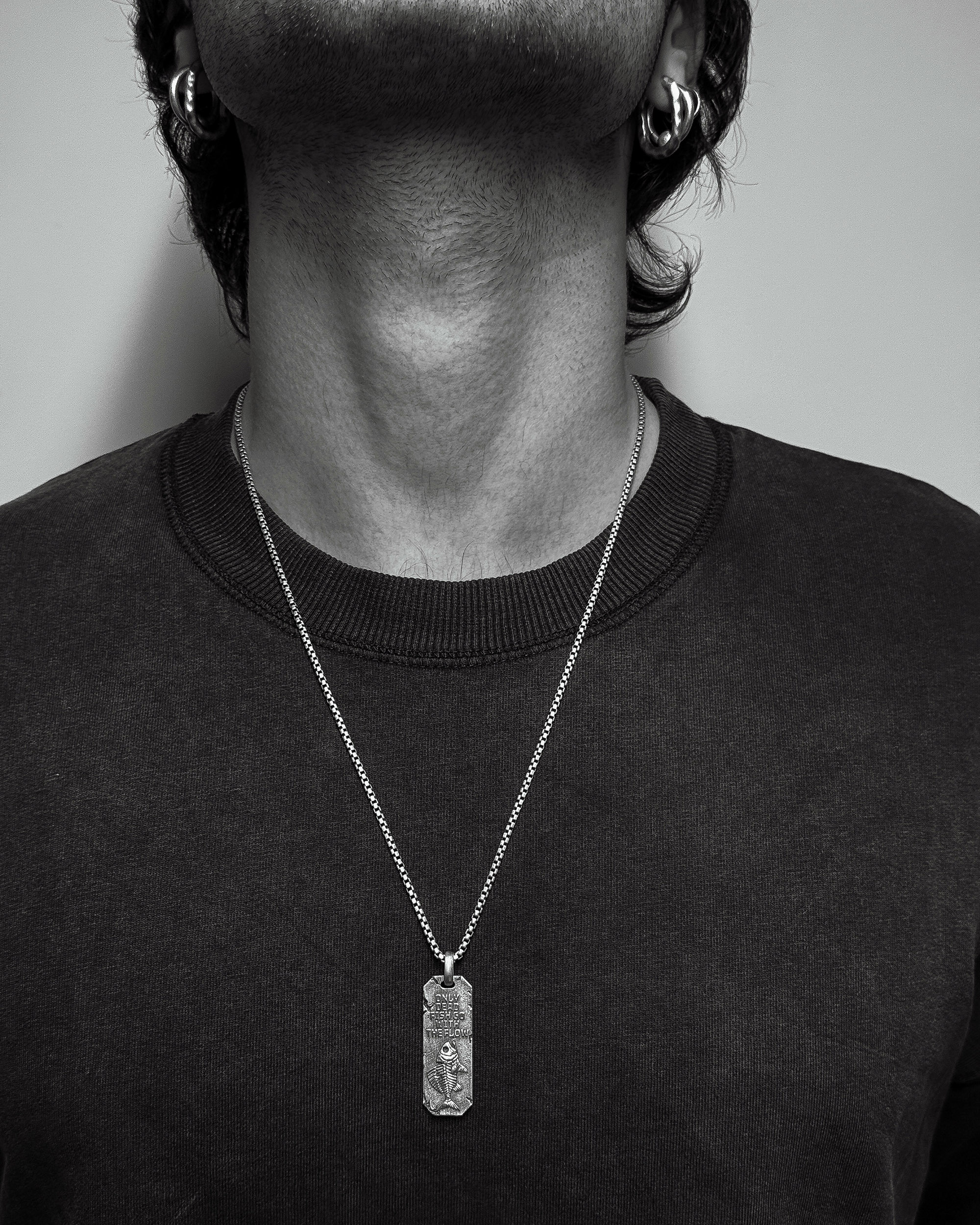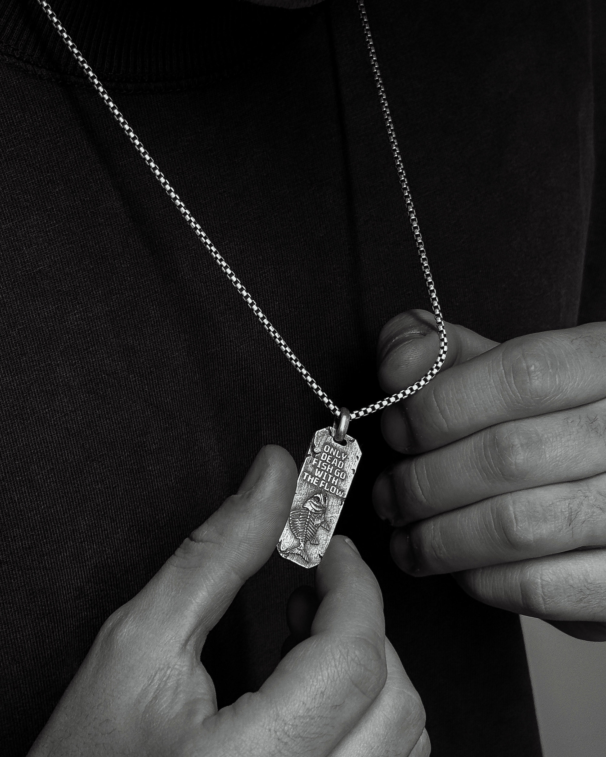 AGAINST THE FLOW (z angielskiego — „pod prąd”) to srebrny wisiorek z napisem “ONLY DEAD FISH GO WITH THE FLOW” — „Tylko martwe ryby płyną z prądem”.