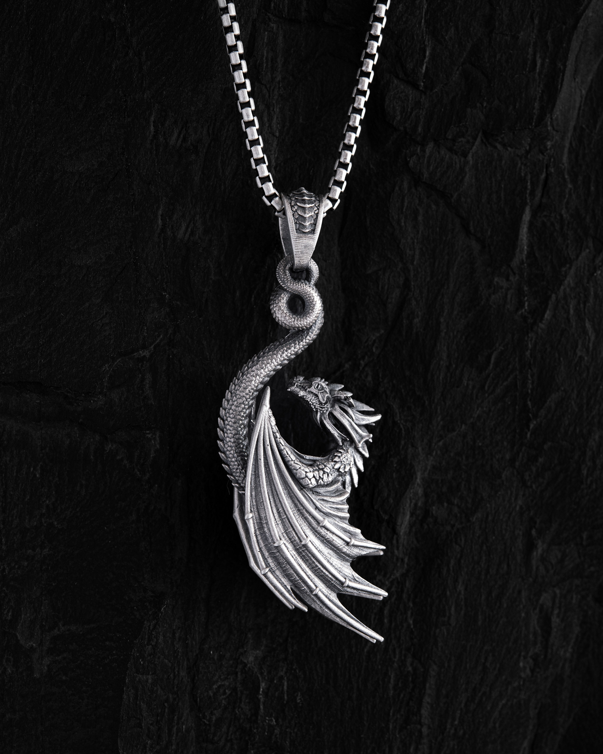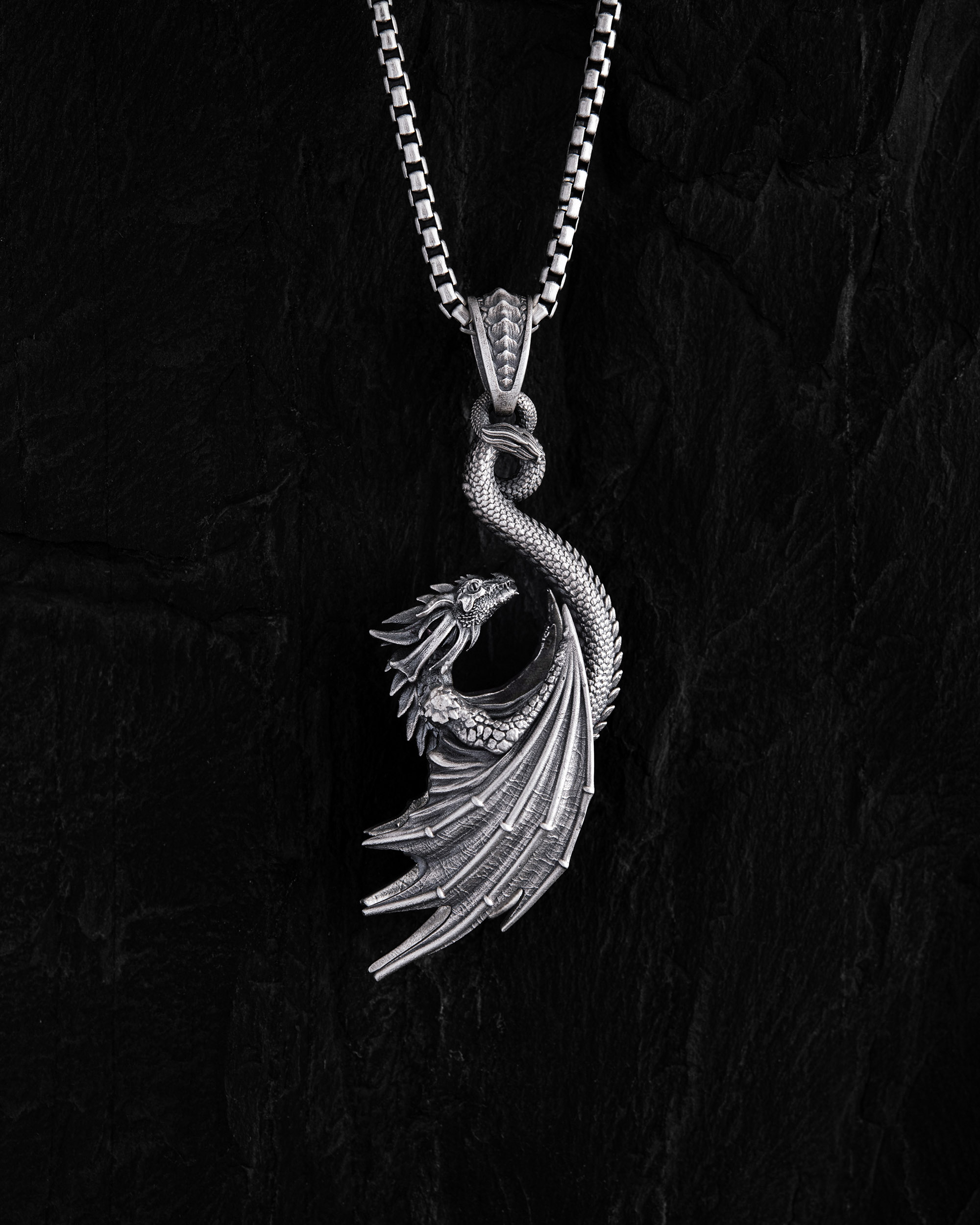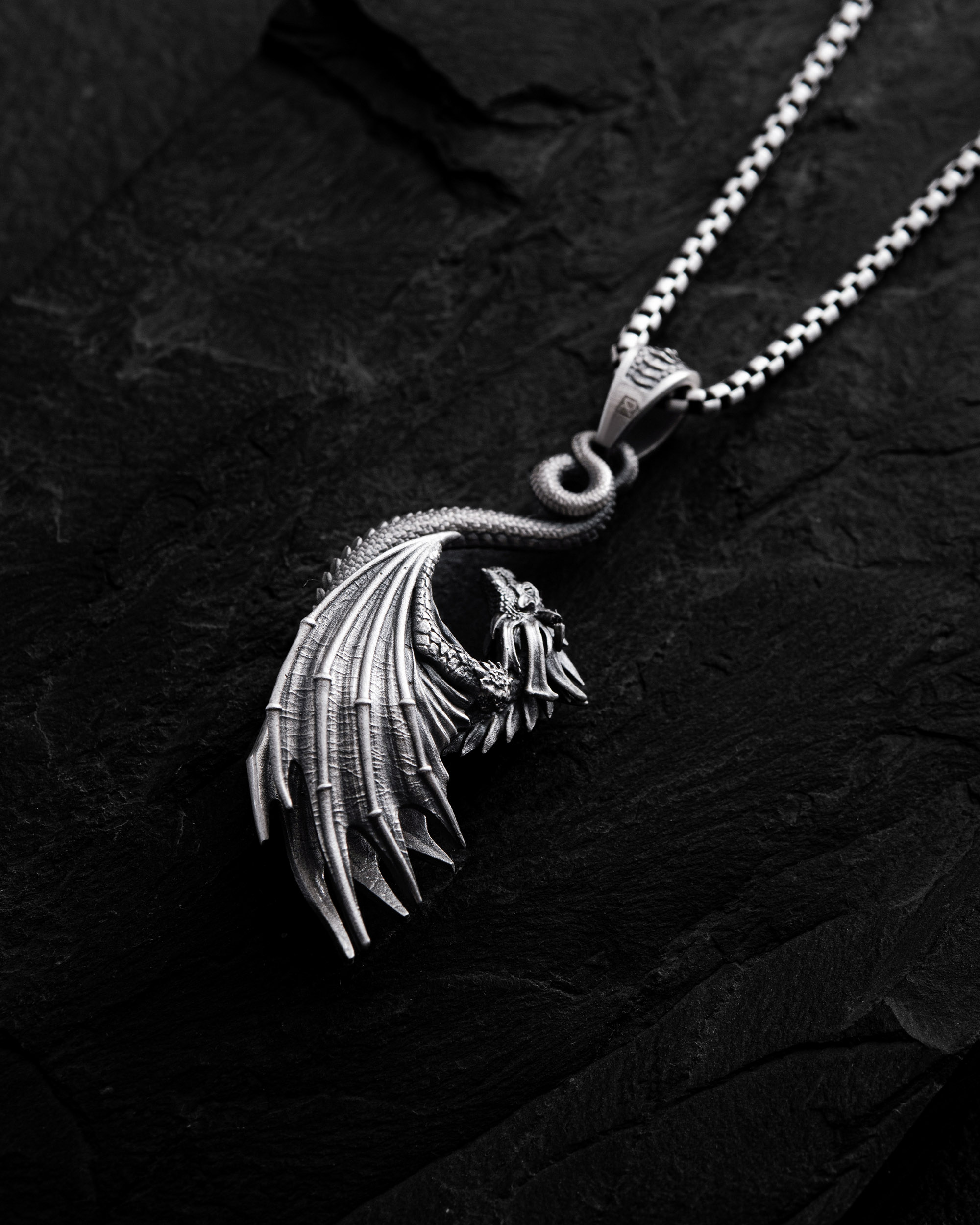 Srebrny wisiorek “DRAGON” (Smok) — symbol potęgi, mądrości i ochrony. W starożytnych kulturach smok uosabia ogień życia, siłę ducha i władzę nad żywiołami. Jego zakrzywiony kształt i precyzyjna faktura oddają ruch energii budzącej się w człowieku. Ten wisiorek stworzono dla tych, którzy nie boją się rzucać wyzwania światu i noszą w sobie ogień determinacji oraz niezależności. DRAGON to talizman siły, kontroli i wewnętrznej równowagi.
