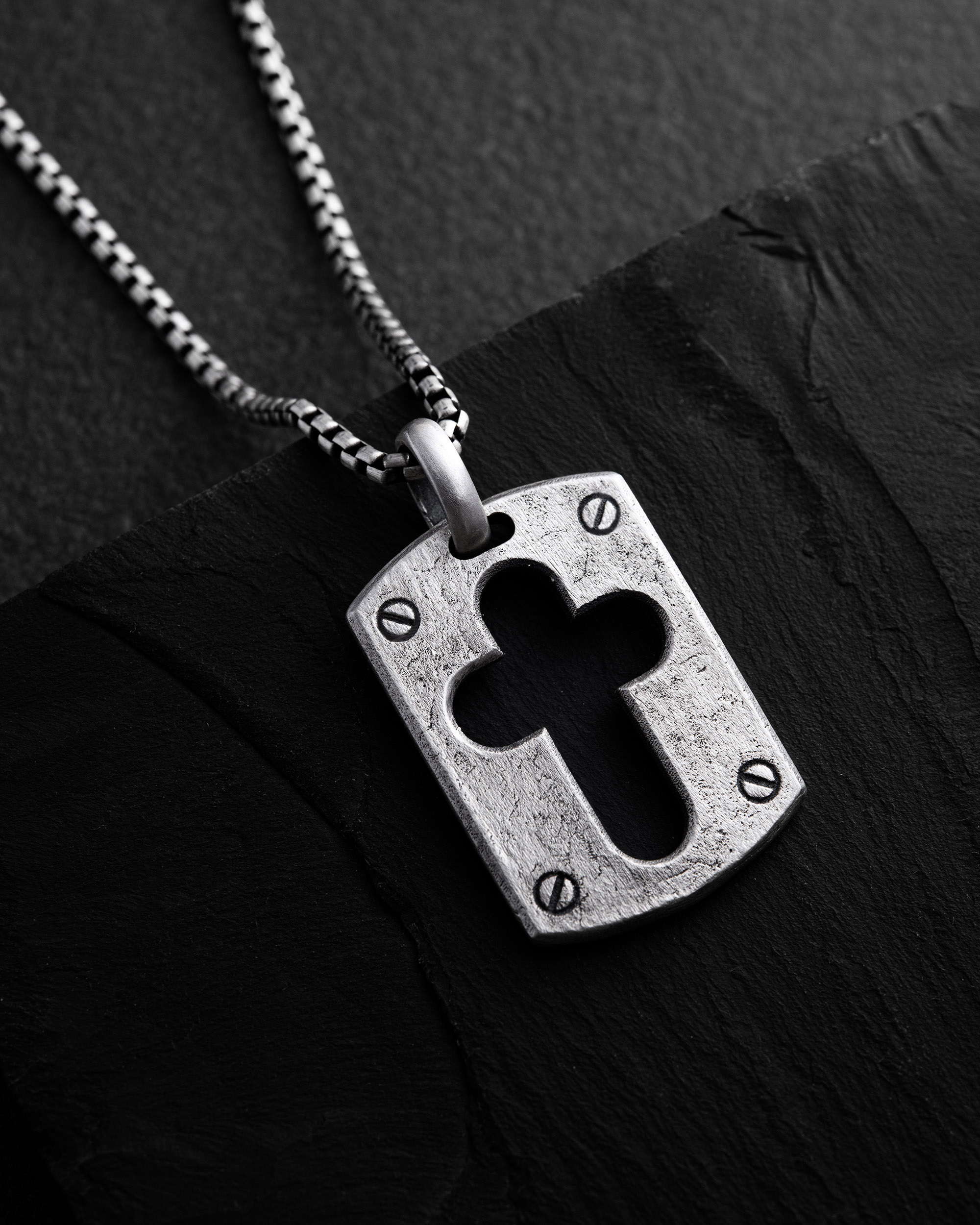 Wisiorek z wycięciem w kształcie krzyża, przez które przechodzi światło. To przypomnienie, że prawdziwa siła tkwi nie na zewnątrz, lecz wewnątrz, i że nawet przez człowieka zahartowanego przez życie i próby przebija się promień wiary i dobroci.