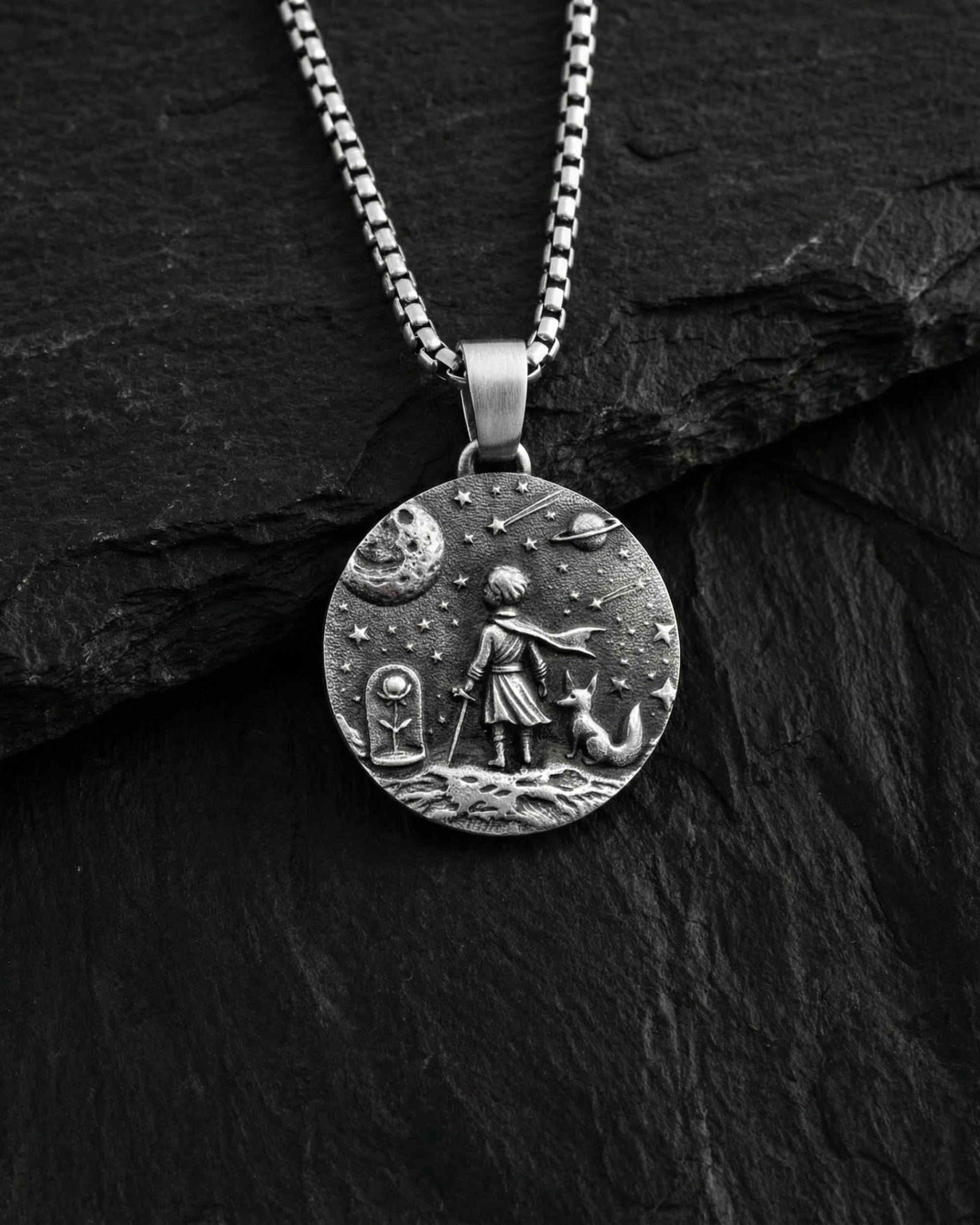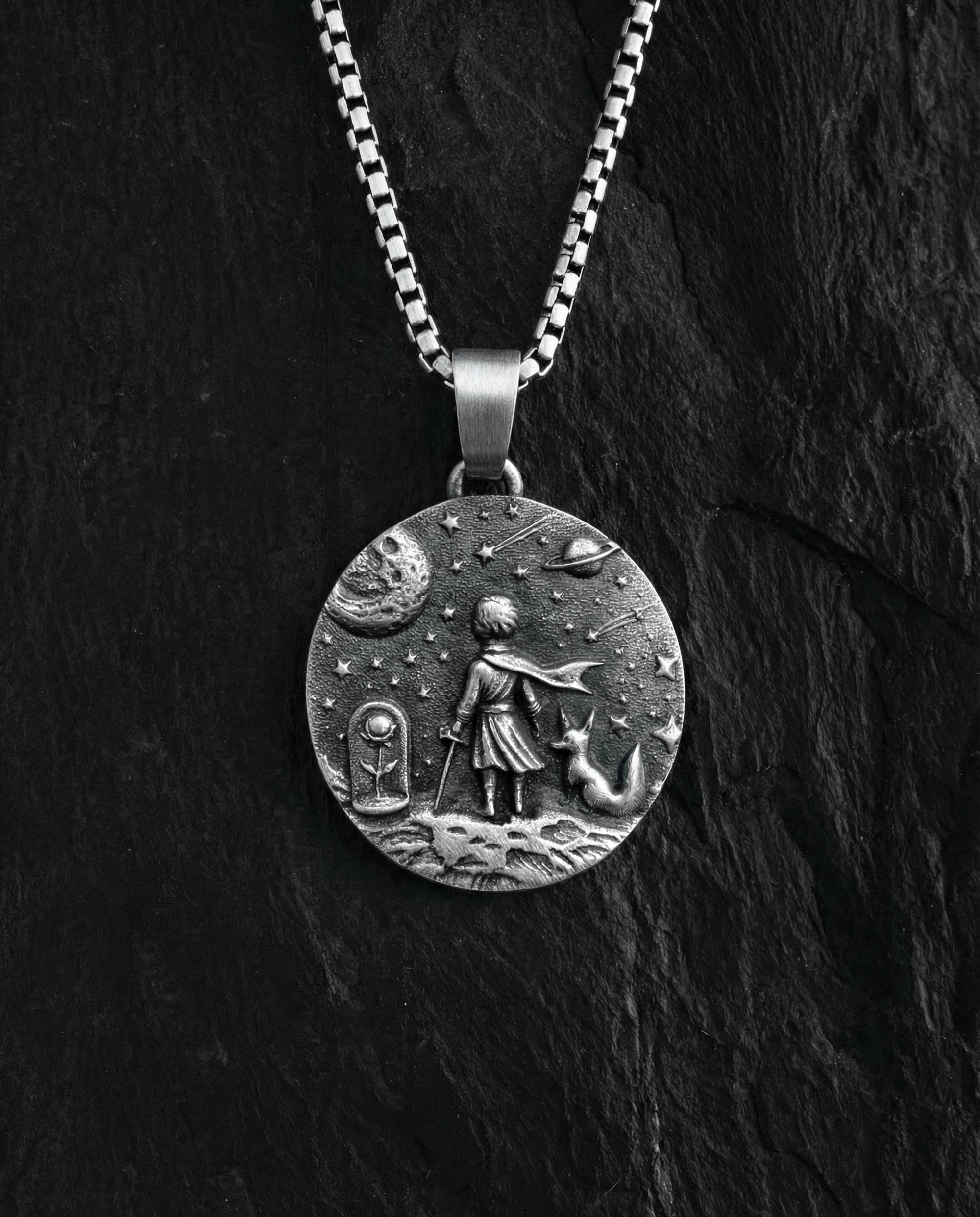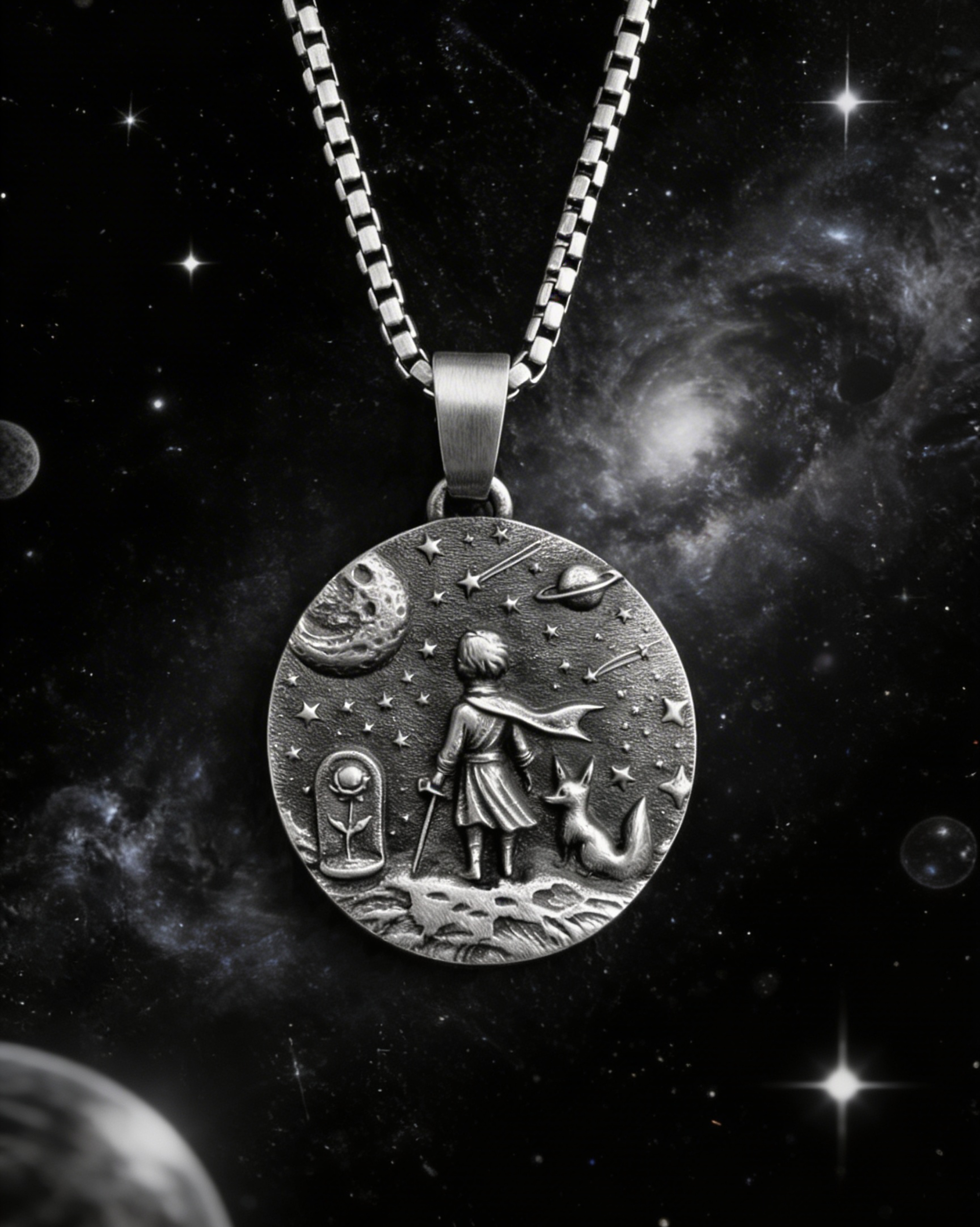 Kompozycja wisiorka oddaje moment ciszy pośród gwiazd — przestrzeń, w której człowiek pozostaje sam na sam ze sobą. Mały Książę stoi na swojej planecie, a obok niego lis jako symbol zaufania i więzi, która nie potrzebuje słów. Gwiazdy wokół to nie tylko detal, lecz przypomnienie o własnej drodze, wyborach i odpowiedzialności za to, co staje się naprawdę ważne.